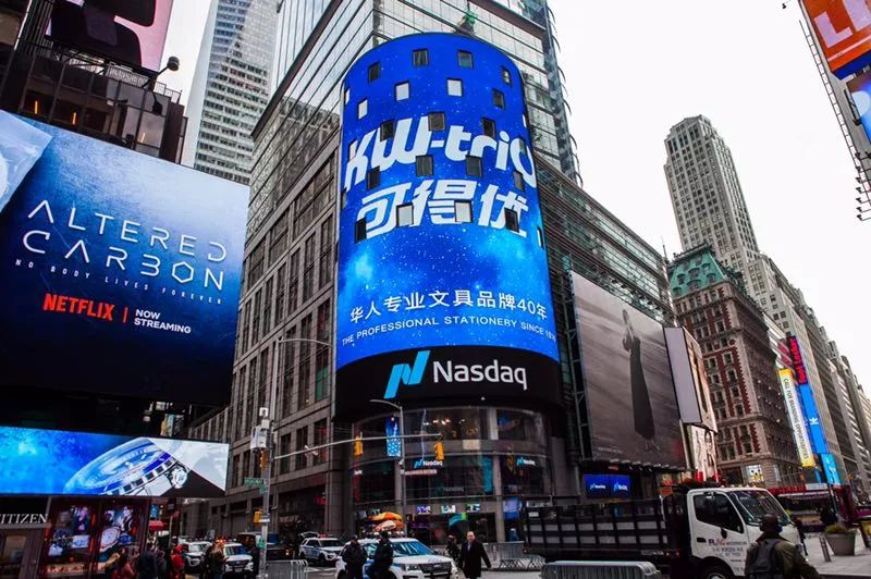 2018年,可得優(yōu)KW-triO的形象廣告強勢登陸納斯達(dá)克大屏幕,以耀眼的藍(lán)色點亮了紐約街頭,向世界展現(xiàn)了可得優(yōu)文具的氣度與雄心,彰顯了華人文具的強大實力。