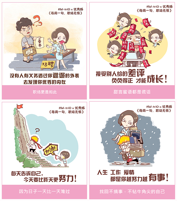 可得優(yōu)原創(chuàng)造出的人物形象優(yōu)秀姐代表著機(jī)智、聰明、喜愛(ài)冒險(xiǎn)的性格,她對(duì)自我工作態(tài)度有要求,是努力在職場(chǎng)生存與邁進(jìn)的主管人物。從她打滾職場(chǎng)多年的經(jīng)驗(yàn)、歷練與啟悟,我們可以延伸到笑對(duì)人生的態(tài)度,發(fā)現(xiàn)生活中的正能量。