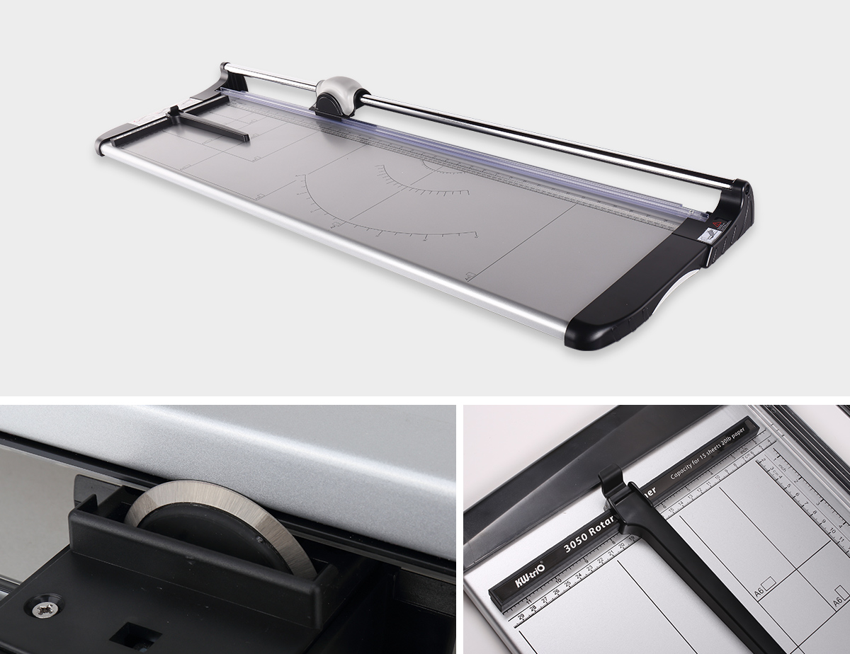 滾動刀頭,精鋼刀刃,寬幅工作臺,標(biāo)尺刻度清晰耐磨,金屬立式支架,