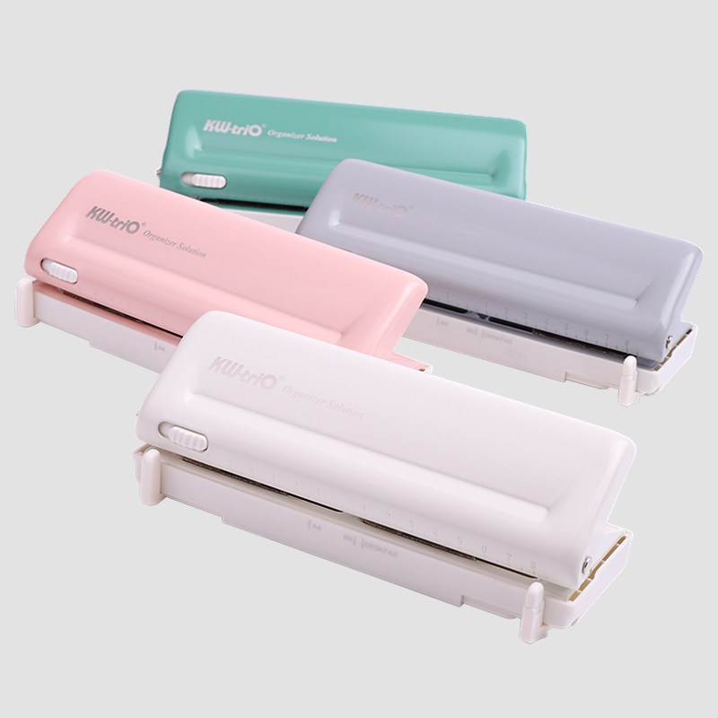 用于自制活頁(yè)紙,適配6孔/9孔活頁(yè) (A4/A5/A6/A7/Mini/B5/Personal/Deskfax) 一次打孔10張,非標(biāo)規(guī)格紙張打孔也很方便, 可調(diào)刀組間距,金屬烤漆顏值在線, 立體塑膠底墊,創(chuàng)新聯(lián)動(dòng)式定位尺紙張 定位打孔方便快捷
