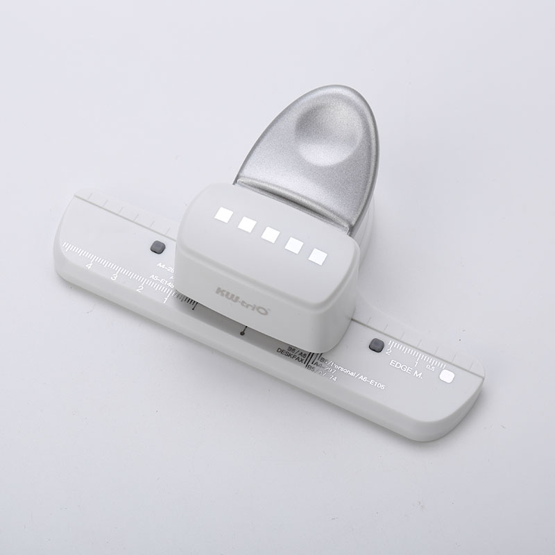 預設多種標準紙張規(guī)格定位標尺。預設孔位測量標尺,可測量已有內頁紙張孔位側邊距,定位相同側邊距打孔。金屬烤漆顏值在線,手感舒適質感升級。輕便杠桿結構,金屬刀頭,刀口鋒利,堅固耐用。立體塑膠底墊,底部可收集紙屑。