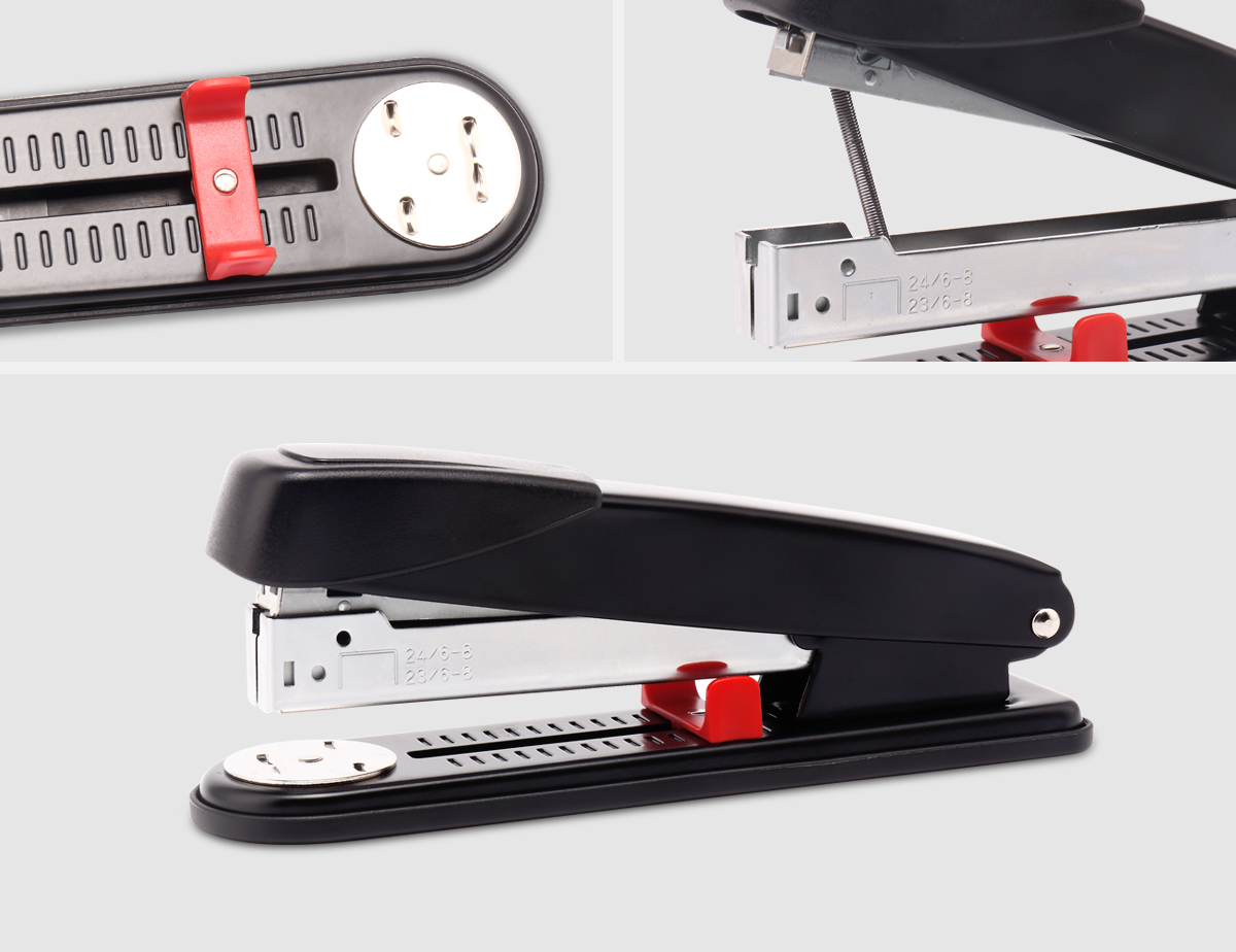 加長(zhǎng)型可裝兩排訂書針 附有擋紙塊 能準(zhǔn)確定位裝訂深度 防滑底墊設(shè)計(jì) 柔軟按墊 舒適方便